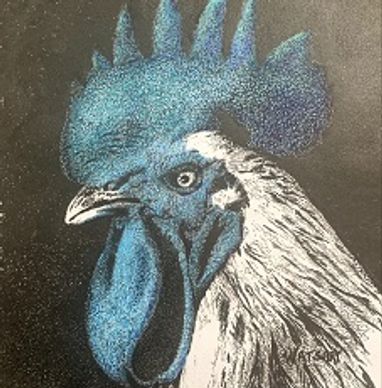 The Juror's comments: Azure Majesty commands attention with its bold, graphic depiction of a rooster against a deep black background. The comb and wattle, rendered in striking blue, display subtle texture and depth, adding richness and sophistication. Precise lines and careful structure give the bird a strong presence, making this an iconic image.