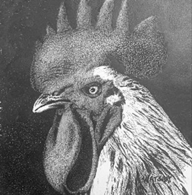 The Juror's comments: Azure Majesty commands attention with its bold, graphic depiction of a rooster against a deep black background. The comb and wattle, rendered in striking blue, display subtle texture and depth, adding richness and sophistication. Precise lines and careful structure give the bird a strong presence, making this an iconic image.