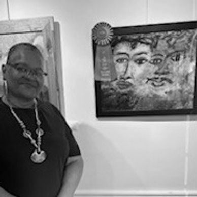 This is a very eye-catching piece. Two faces are merging together. Very hot colors for the faces, surrounded by the cooler background. It's a courageous use of black. I'm reminded of paintings by George Rouault. Very expressive, Lydia.